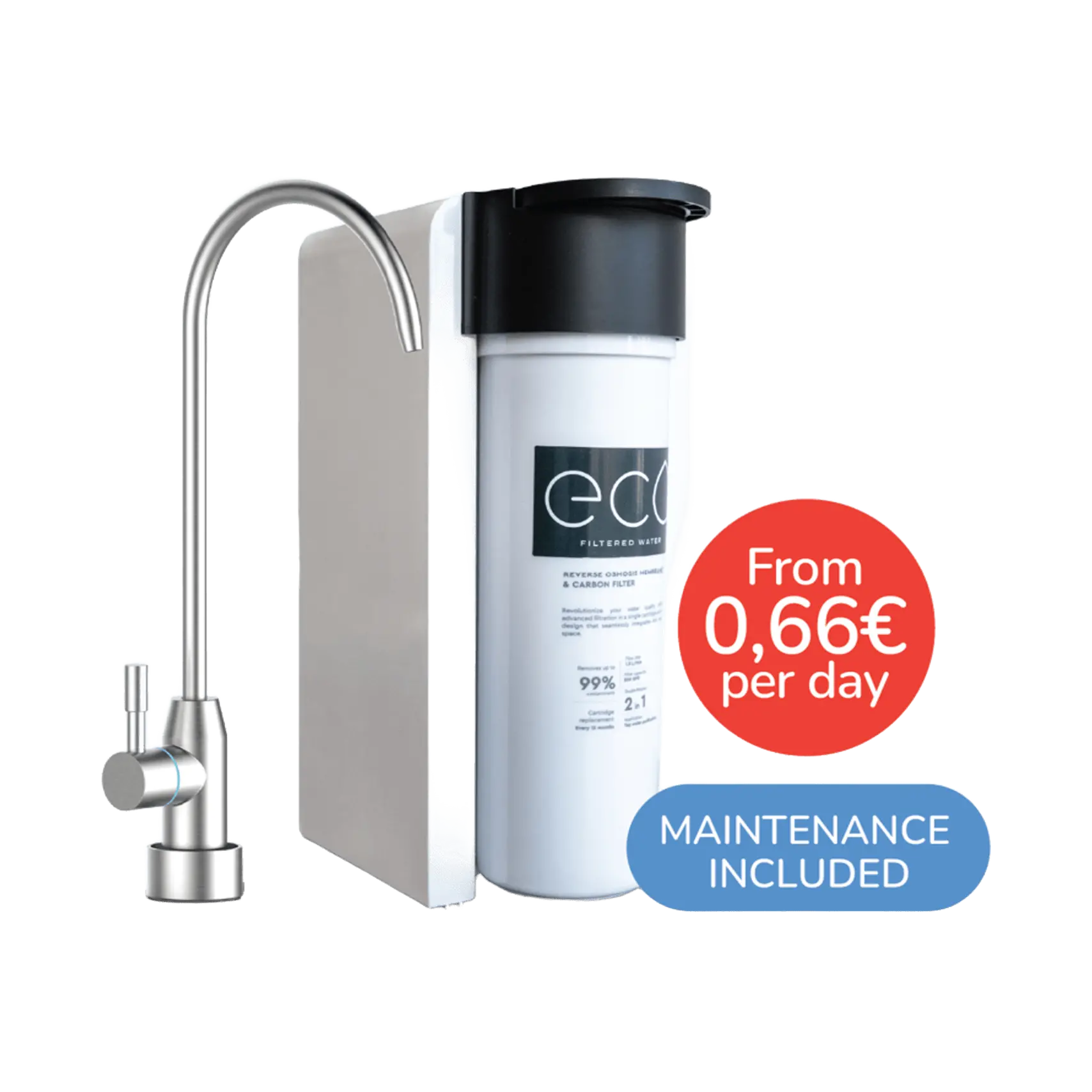 Purified water is dispensed through a separate, small, and discreet tap installed on the countertop alongside your kitchen faucet, ensuring both convenience and elegance in everyday use. For added versatility, you can also opt for the ECO tap, allowing both tap water and purified water from a single point of use, seamlessly replacing your existing faucet.
